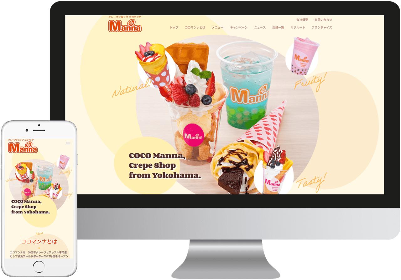 クレープショップということで、円形、卵型など曲線をちりばめて親しみやすさ、楽しさを表しました。メニューの写真をファーストビューから複数配置することで、シズル感、品数の豊富さを感じられるように心がけました。
